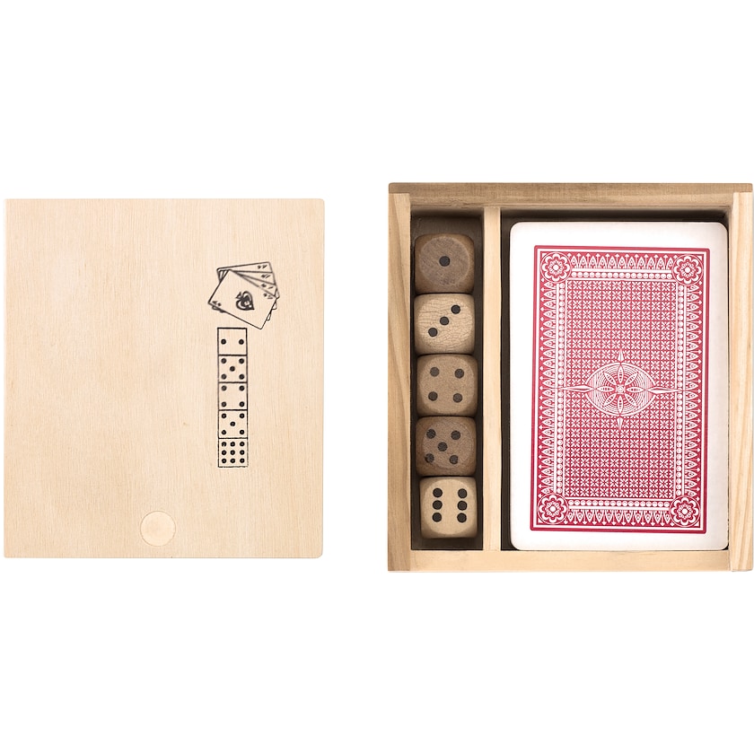 Set de jeu avec cartes à jouer et cinq dés. Le jeu de cartes compte 54 cartes. Le set est livré dans une jolie boîte en bois. Un set de jeu que tout le monde devrait avoir chez soi !