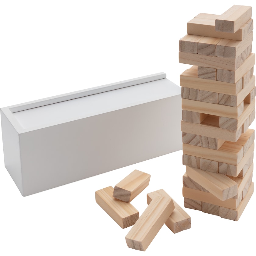 Jeu de jenga en bois certifié FSC. Le set comprend 48 blocs de construction. Livré dans une boîte de rangement blanche en bois.