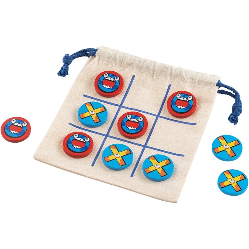 Jeu de morpion classique. Le jeu est livré dans un petit sac en coton pouvant également servir de plateau de jeu. La personnalisation est réalisée sur la face arrière du sac en coton. Les pièces de jeu sont en bois.
