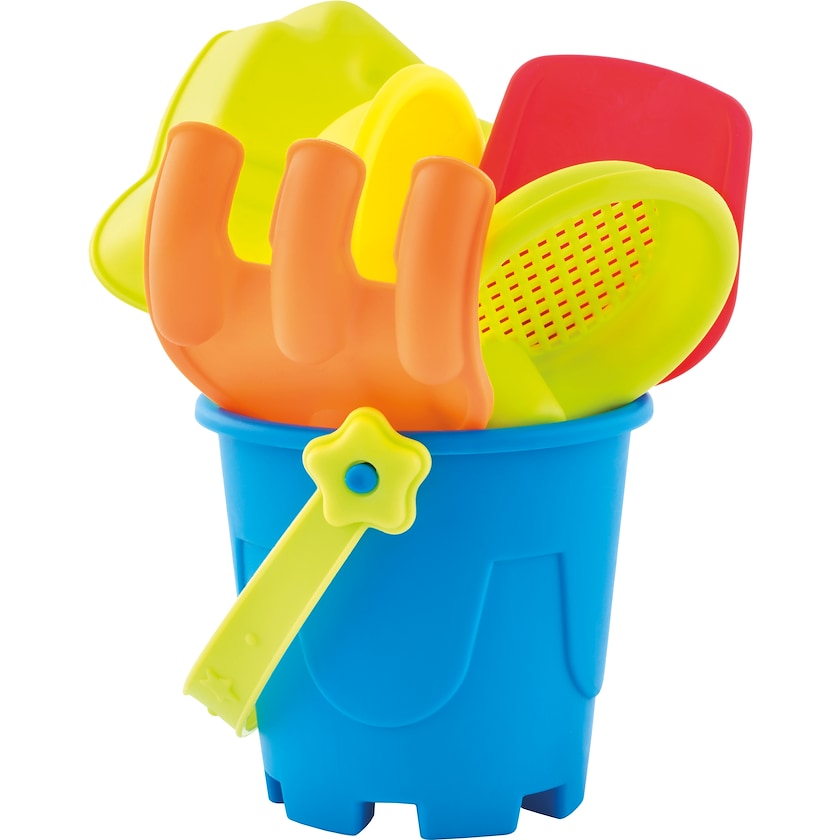 Seau de plage avec pelle, râteau et deux moules. L'ensemble des pièces est fourni selon des couleurs aléatoires. La personnalisation est réalisée sur le sachet filet, consultez le template d'impression pour plus d'informations. Commandez un seau de plage personnalisé chez Axon Profil !