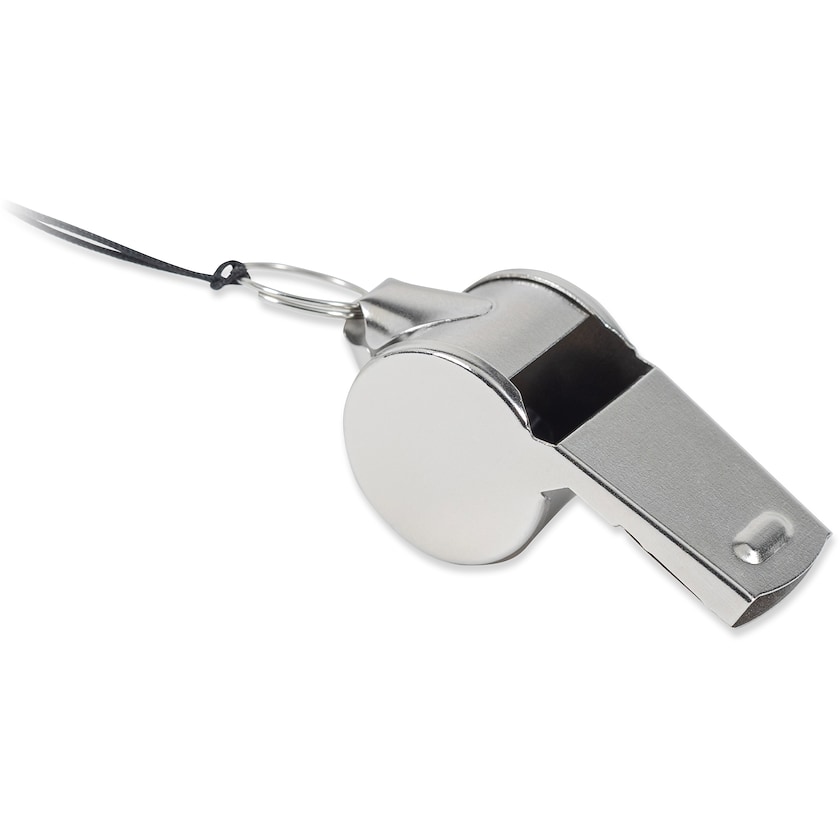 Sifflet en métal. Le sifflet est livré avec une ficelle. Le marquage se fait par impression ou gravure laser.