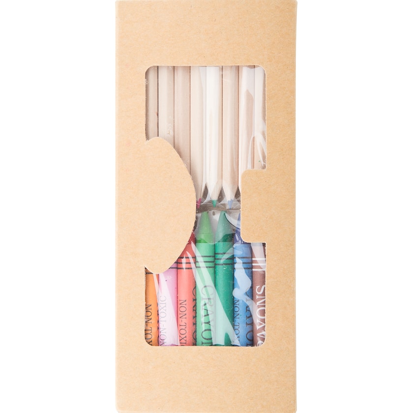 Set de 10 crayons de couleur et 9 crayons de cire dans une boîte en carton de couleur nature.