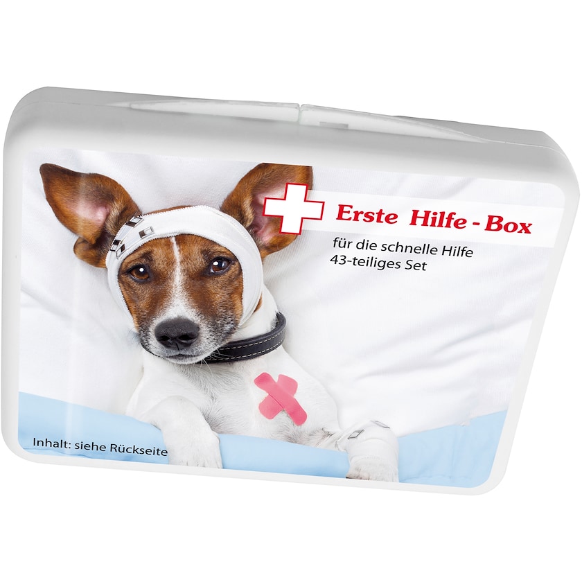Boîte de premiers secours avec étiquette personnalisée par quadrichromie. Contient 43 articles de premiers soins: 1 x compresse de 76 x 50 mm, 1 adhésif autocollant de 1,25 x 3,3 m, 1 x pansement de 100 x 50 mm, 10 x pansements de 72 x 19 mm, 10 x pansements de 57 x 19 mm, 10 x pansements de 40 x 10 mm et 10 x pansements ronds de 22 x 22 mm. À l'arrière se trouve une étiquette comportant la liste du contenu.
