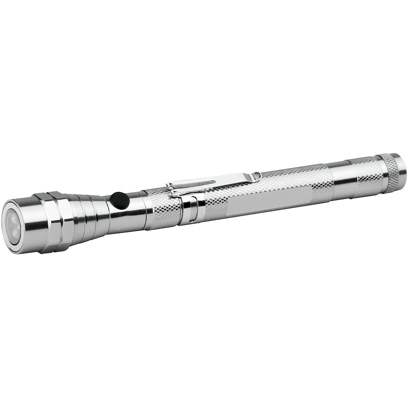 Lampe de poche télescopique avec 3 ampoules LED. L'Electra est équipée d'aimants et peut être pliée de façon à éclairer les endroits les plus difficiles d'accès. La lampe de poche est intégralement en métal.