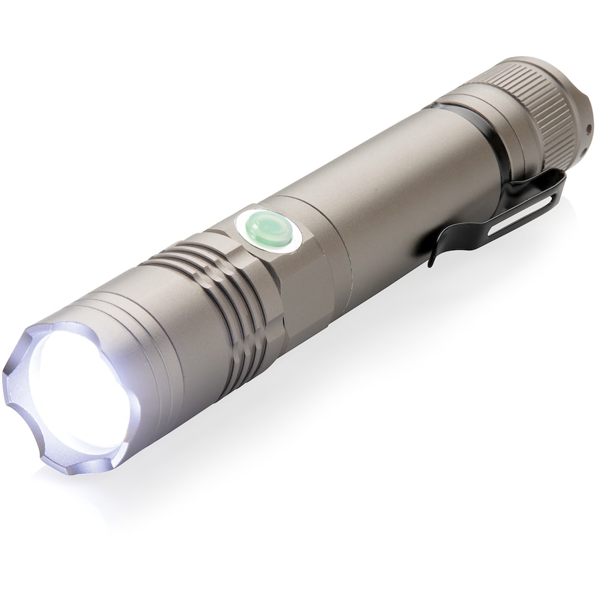 Lampe de poche 3W rechargeable. La Grayson peut éclairer sur jusqu'à 200 mètres et possède trois réglages lumineux : luminosité complète, demi-luminosité et clignotante. La batterie permet 8 heures d'utilisation sur une recharge. La lampe se recharge en environ 2 heures. La lampe de poche est classée IPX 4 et peut être utilisée par mauvais temps. Câble de recharge micro-USB inclus.