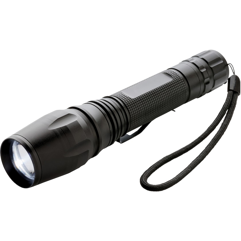 Grande lampe de poche robuste avec LED puissante. La LED est de type Cree et est très puissante. La lampe de poche est étanche et peut résister à des chûtes de un mètre de haut. La largeur du faisceau lumineux est réglable. Livrée avec piles.