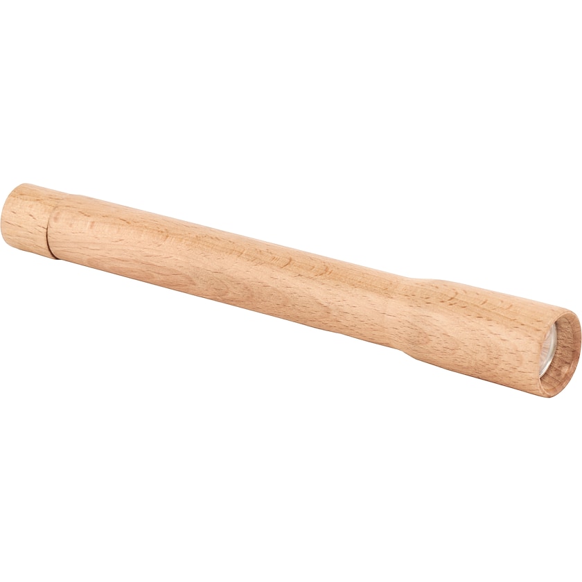 Lampe de poche unique en bois de hêtre. La lampe de poche intègre une ampoule COB puissante. Elle est alimentée par 3 piles AAA (non incluses).