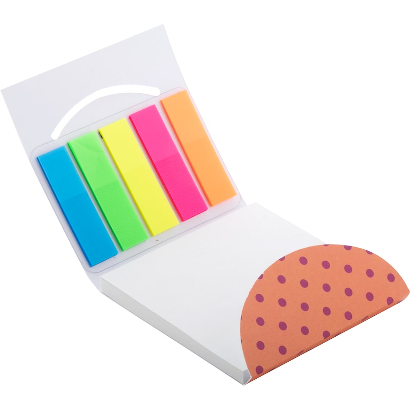 Ensemble pliable avec onglets marqueurs et bloc-notes. Il y a 100 onglets au total, répartis en cinq couleurs différentes. Chaque onglet mesure 44 x 12 mm. Le bloc-notes mesure 75 x 75 mm et contient 50 feuilles adhésives sur une face.