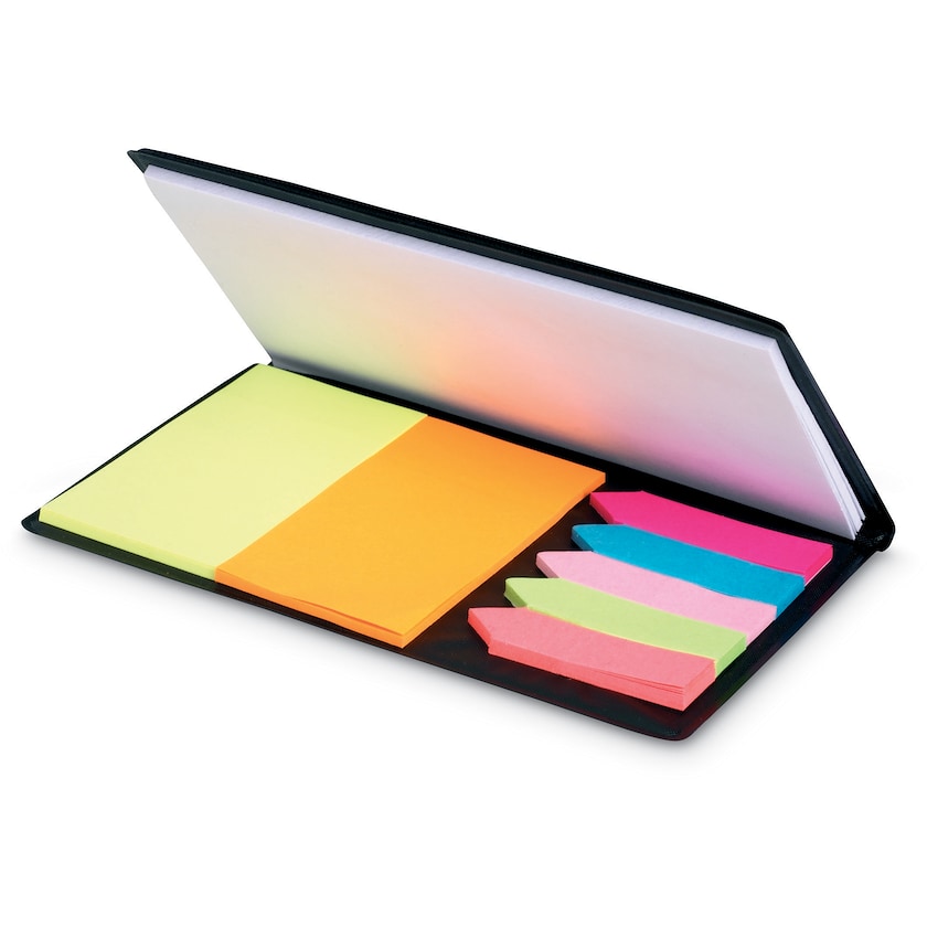 Étui comportant un bloc de feuillets, un bloc-note et des languettes adhésives.