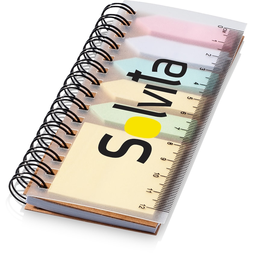 Kit de languettes adhésives dans un cahier à spirale avec bloc-note. Le Spirale comporte cinq couleurs de languettes adhésives, à raison de 25 languettes par couleur, un bloc-note adhésif de 25 feuilles ainsi que 40 feuilles lignées blanches. La couverture en plastique peut également servir de règle.