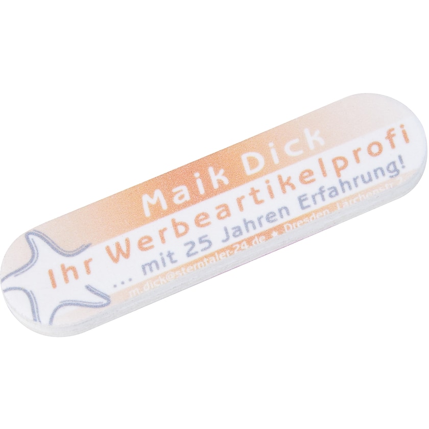 Petite lime à ongles de qualité professionnelle. La lime à ongles est initialement blanche. L'impression vient ensuite recouvrir l'un des côtés. Le noyau est fabriqué en plastique, la surface est sablée.
