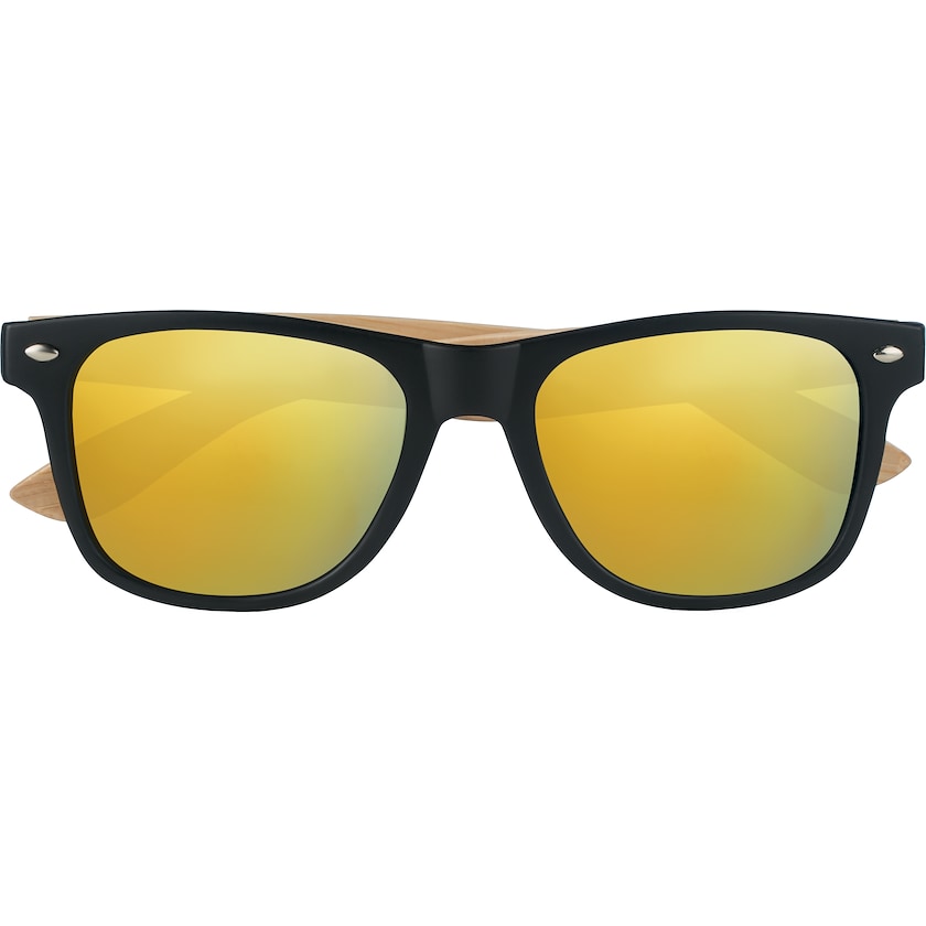 Lunettes de soleil avec verres miroir et branches en bambou. Les lentilles ont un indice de protection UV400. La personnalisation est réalisable par impression ou par gravure laser sur l'une des branches.