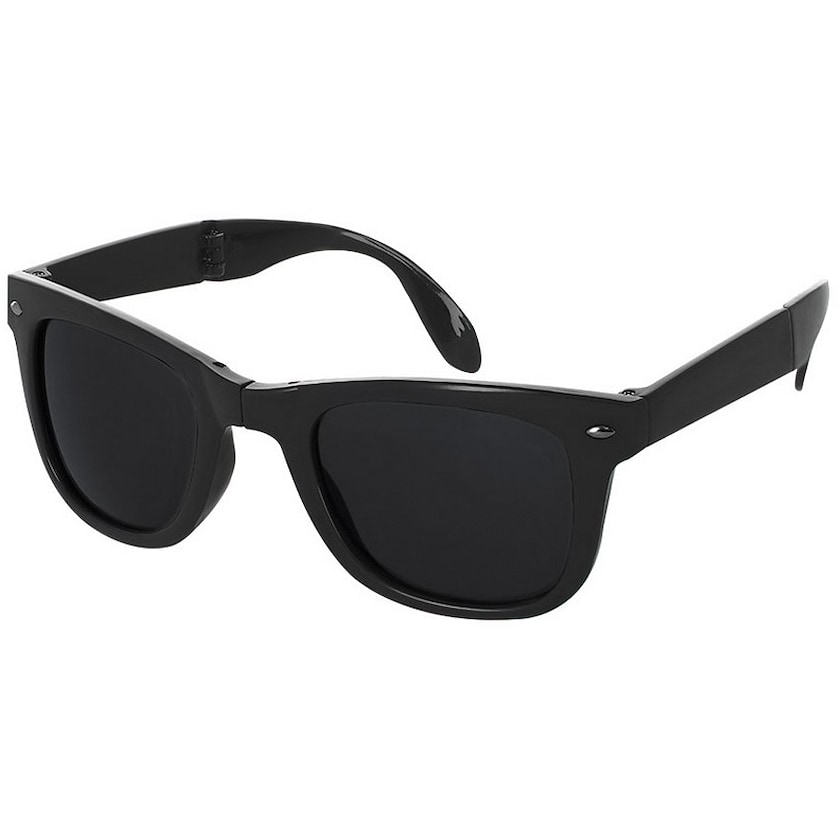 Lunettes de soleil pliables entièrement noires avec votre propre imprimé. Les verres offrent une protection UV400. Livrés dans un étui à lunettes zippé.