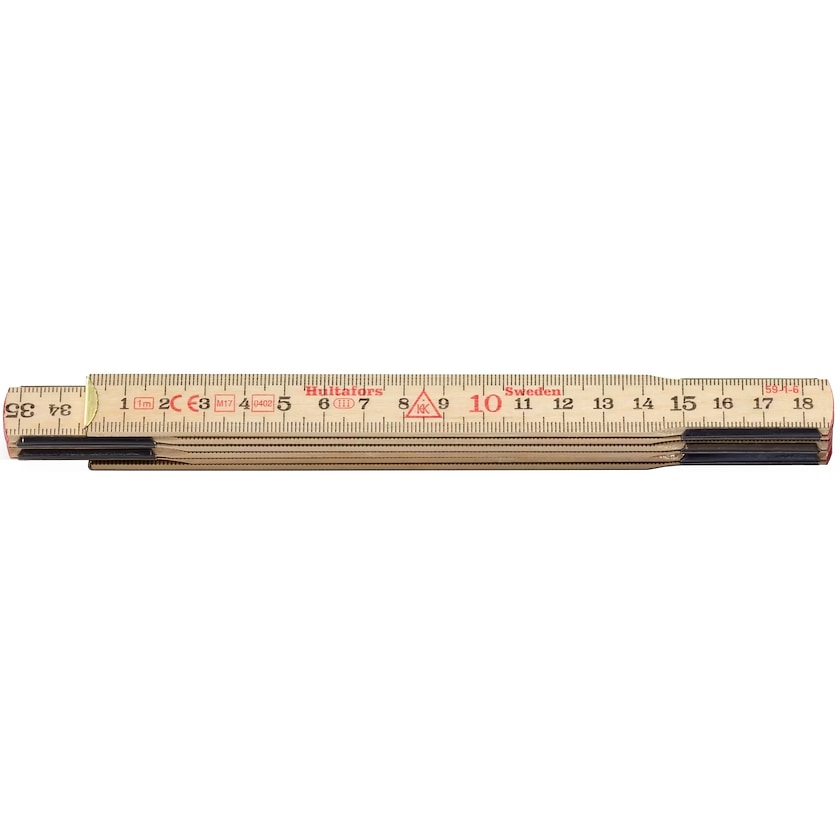 Le mètre pliant Hultafors intemporel en version 1 mètre. Le mètre pliant est fabriqué en bouleau pubescent avec des articulations en acier suédois. La gradation métrique est indiquée en noir, les chiffres des décimètres en rouge, des deux côtés.
