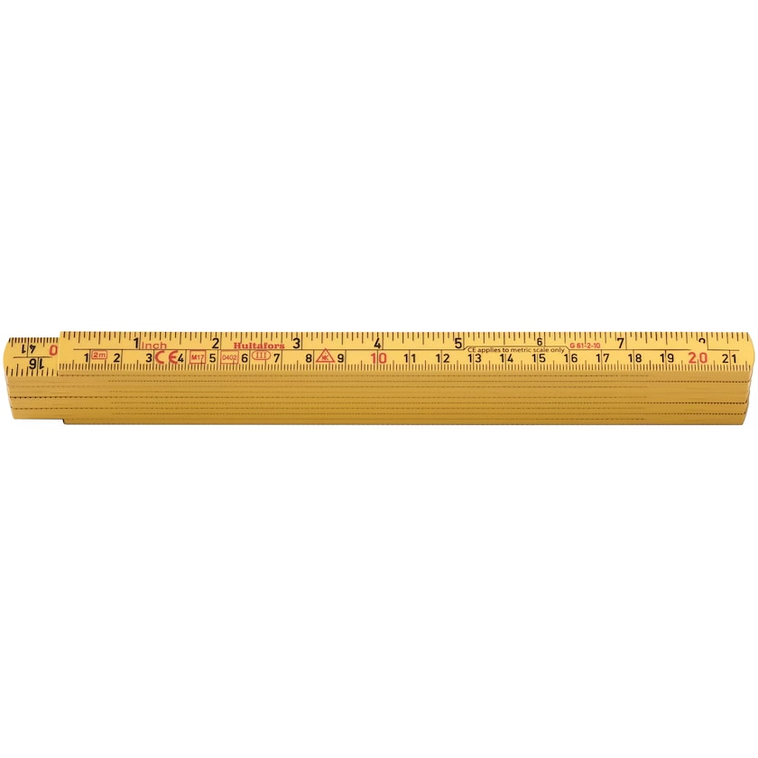 Mètre pliant jaune en polyamide renforcé de fibres de verre. Le matériau possède une excellente résistance à l'humidité. Le mètre pliant a une gradation métrique noire des deux côtés. En bas, la gradation est en unités métrique, tandis qu'en haut la mesure est indiquée en unités impériales.