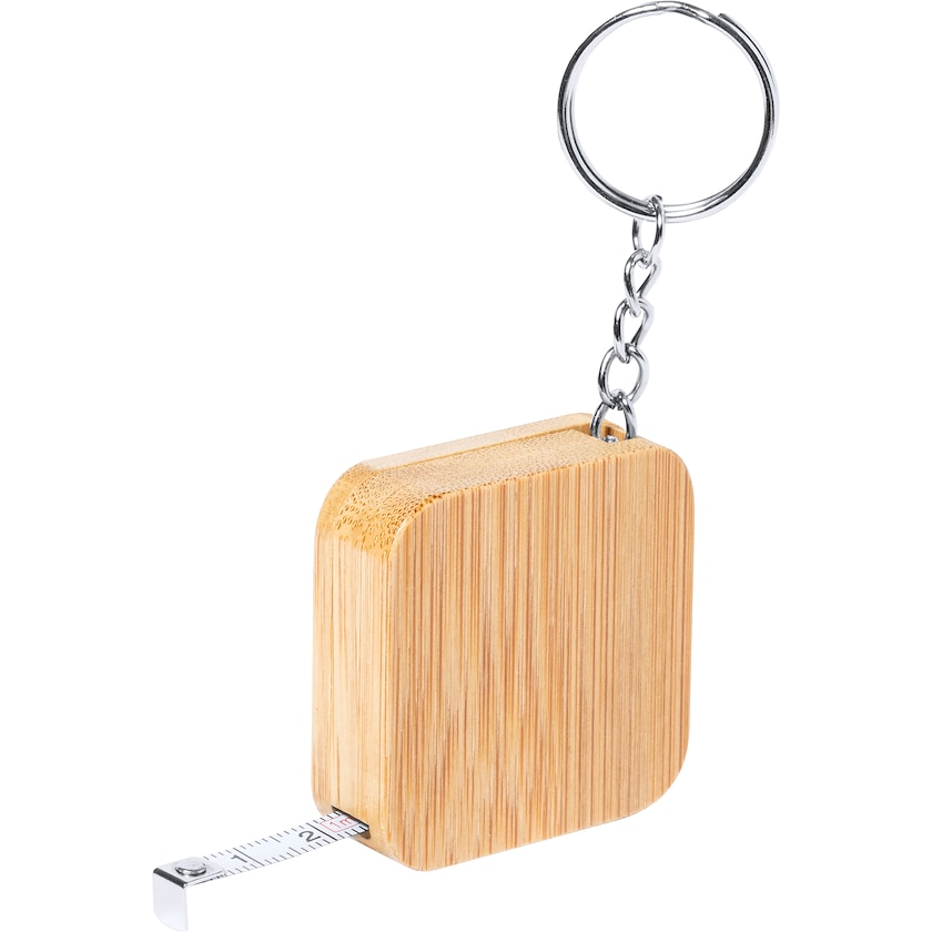 Mètre ruban de 1 mètre avec impression ou gravure laser. Le ruban à mesurer est en bambou et est équipé d'un porte-clés.