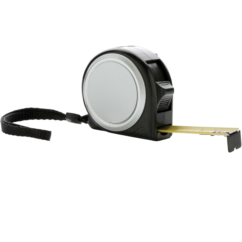 Mètre ruban 19 mm de 5 m livré dans une boîte cadeau. Le mètre ruban est équipé de cordons de poignet et d'un clip pour ceinture.