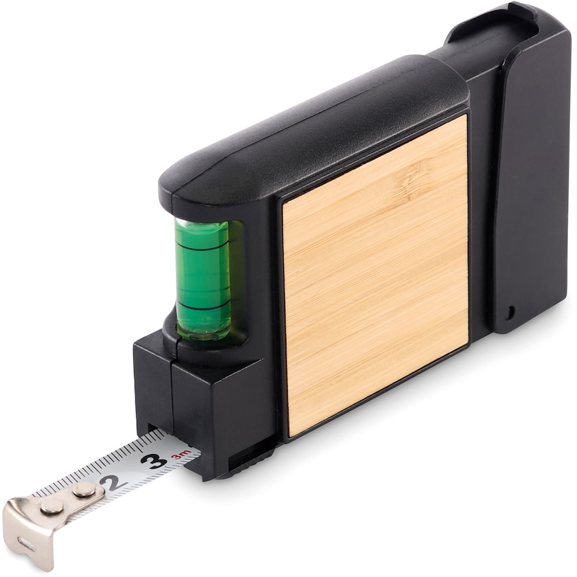 Mètre ruban avec niveau à bulle et jeu de tournevis. Le ruban à mesurer est en métal et le boîtier est en ABS et en bambou.