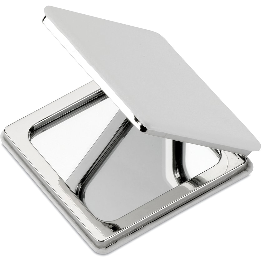 Miroir double avec extérieur en cuir synthétique. Le miroir est maintenu fermé par un aimant. Impression monochrome uniquement.