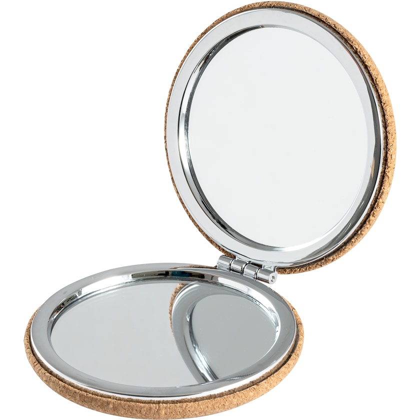 Miroir à maquillage rond avec extérieur en liège. Le Melinda est un double miroir. Il est livré dans un étui en carton couleur nature. La personnalisation est réalisée par gravure laser.