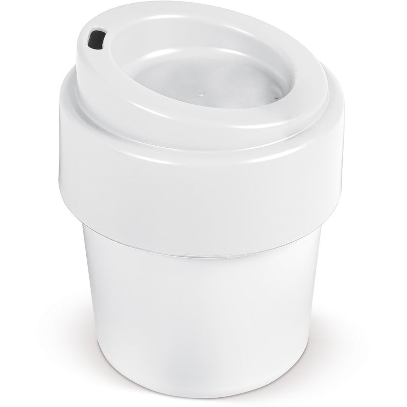 Mug de voyage écologique avec couvercle. Le Bartow est produit en Allemagne. Il est composé de 95% de plastique organique obtenu à partir de canne à sucre. Ce mug est pour ainsi dire indestructible et est en plus empilable. Il est également 100% recyclable. Son design malin permet de garder votre café bien chaud, tandis que les bords extérieurs sont froids. Un mug de voyage malin et un bon choix écologique !