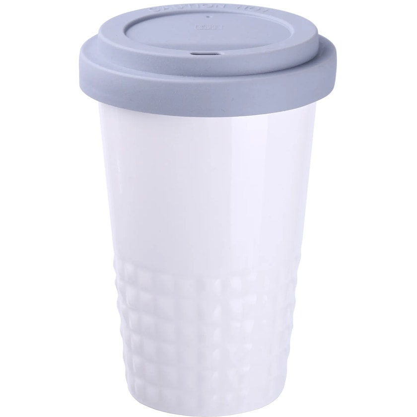 Tasse à emporter en porcelaine bien conçue avec couvercle en caoutchouc. Le fond du mug présente un motif caractéristique agréable à tenir. Grâce aux doubles parois, votre boisson reste longtemps au chaud.