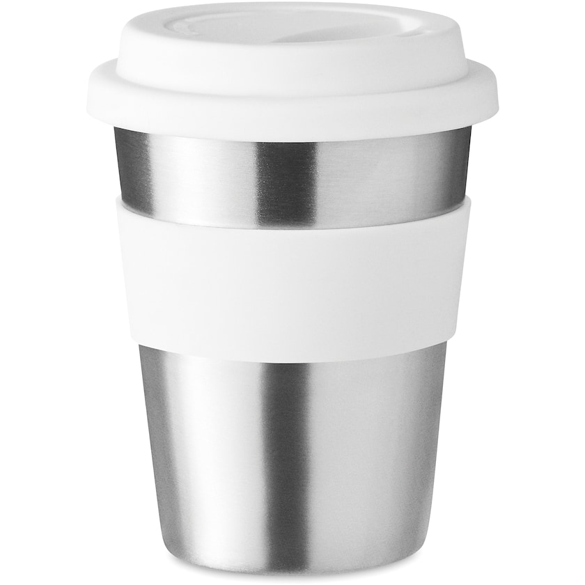 Mug de voyage en acier inoxydable avec couvercle et zone de préhension en silicone. Le mug possède une capacité de 35 cl, ce qui est idéal. Si vous pouvez vous limiter à une impression monochrome, la surface d'impression est de pas moins de 220 x 20 mm, soit bien supérieure à la normale.
