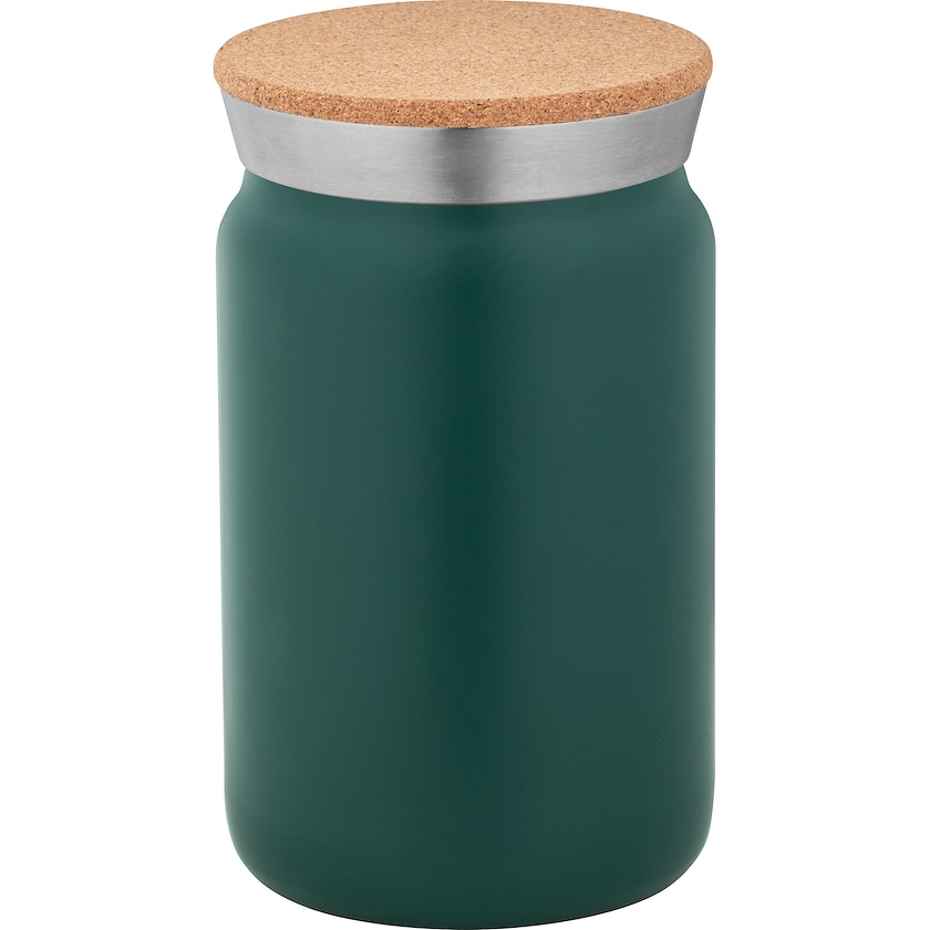 Mug isotherme en acier inoxydable avec couvercle en liège. Grâce à son isolation sous vide en cuivre, la gourde garde les boissons chaudes pendant 5 heures, froides pendant 24 heures. La personnalisation est réalisée par impression monochrome ou par gravure laser.