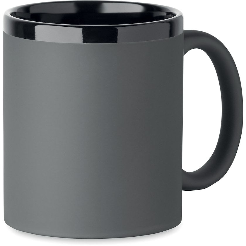 Tasse avec surface douce au toucher et intérieur et bord noirs. Le marquage est réalisé par gravure laser noire. Livré emballé individuellement dans un carton blanc.