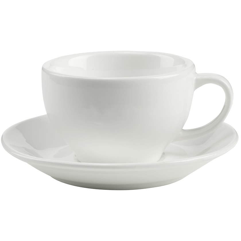 Tasse à cappuccino avec soucoupe assortie. La tasse et sa personnalisation résistent au lave-vaisselle. La personnalisation est réalisée soit sur la tasse, soit sur la soucoupe.