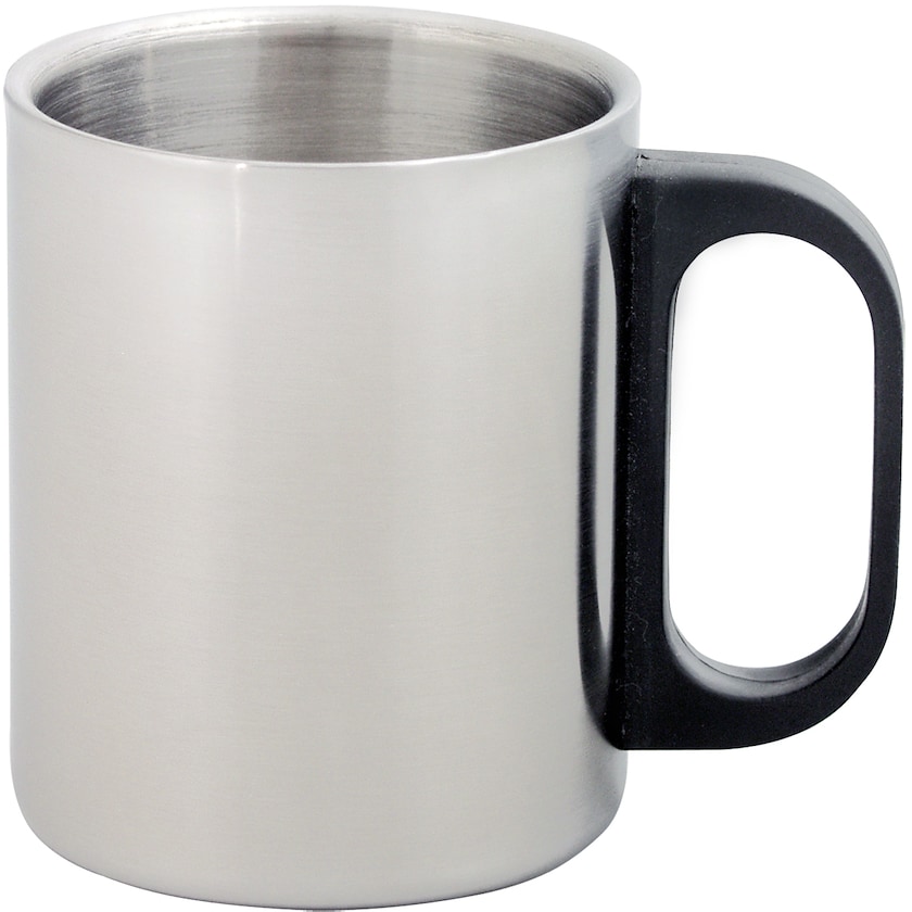 Grand mug en métal avec anse confortable en plastique. Le marquage est effectué soit par impression en deux couleurs maximum ou par gravure laser.