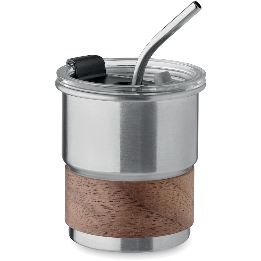 Mug en métal avec paille et anse en bois d'acacia. Le Donau est à simple paroi et composé à 90 % d'acier inoxydable recyclé et à 10 % d'acier inoxydable. Il est étanche.