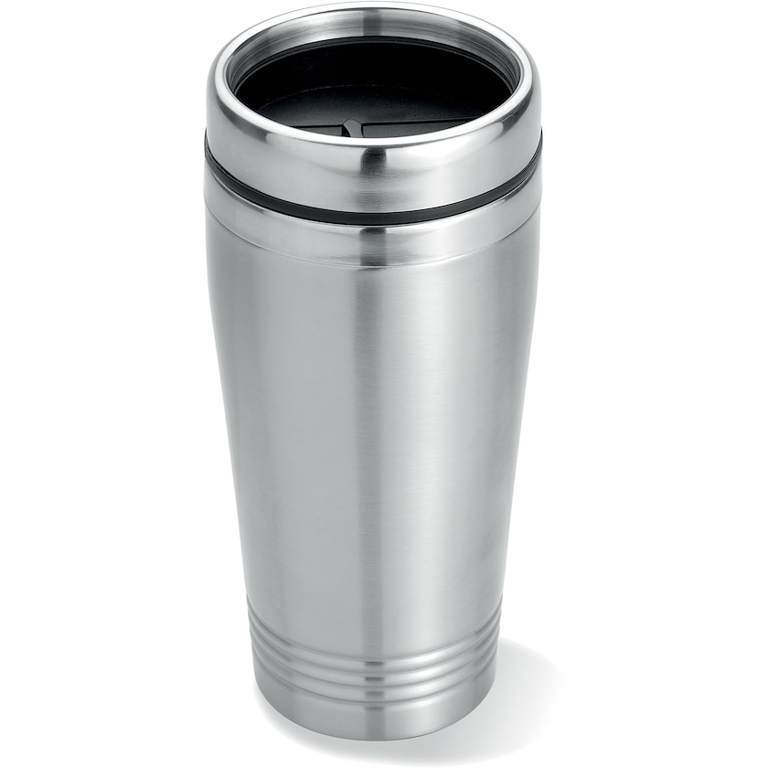 Élégant mug de voyage en métal à parois doubles. Le mug est fabriqué en acier inoxydable et possède un couvercle en polypropylène. La personnalisation est effectuée par impression ou par gravure laser.