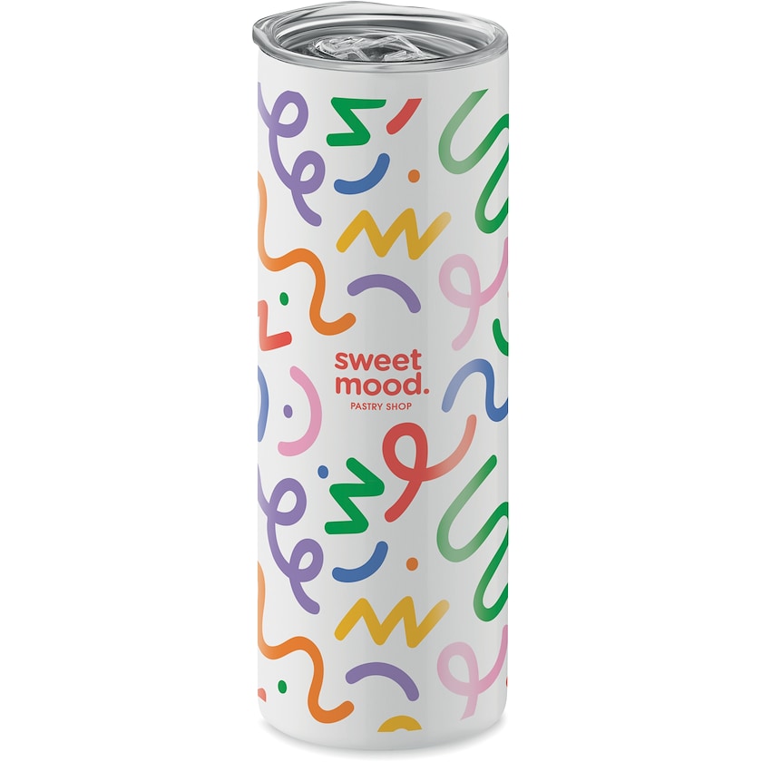 Mug en métal blanc dont l'intégralité de la surface peut être personnalisée. Le High Hill est en acier inoxydable. Grâce à sa paroi double, les boissons restent chaudes ou froides longtemps.