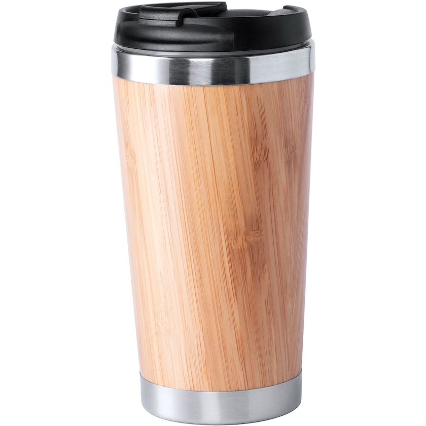 Mug en métal en acier inoxydable avec extérieur en bambou véritable. Le mug possède une contenance de 45 cl et est livré dans une boîte cadeau. La personnalisation est effectuée par gravure laser.
