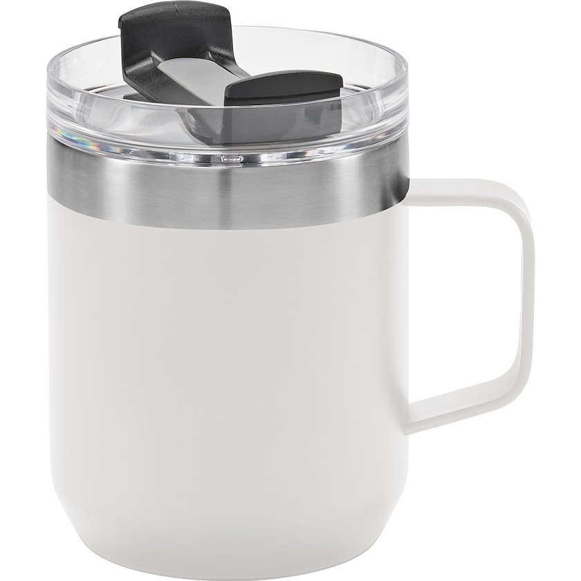 Tasse thermos en acier inoxydable recyclé. La tasse a une sensation rustique et est parfaite aussi bien pour le bureau que pour la nature. Les doubles parois isolées sous vide gardent la boisson chaude ou froide pendant longtemps.