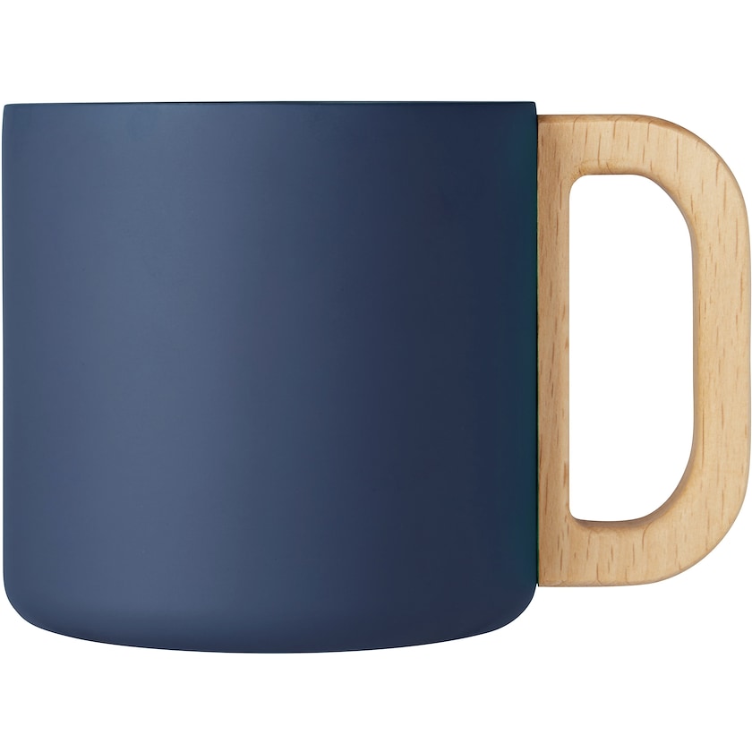 Mug en métal en acier inoxydable recyclé. La tasse est isolée sous vide, ce qui signifie qu'elle garde les boissons chaudes au chaud plus longtemps. Le manche est en bois de hêtre.