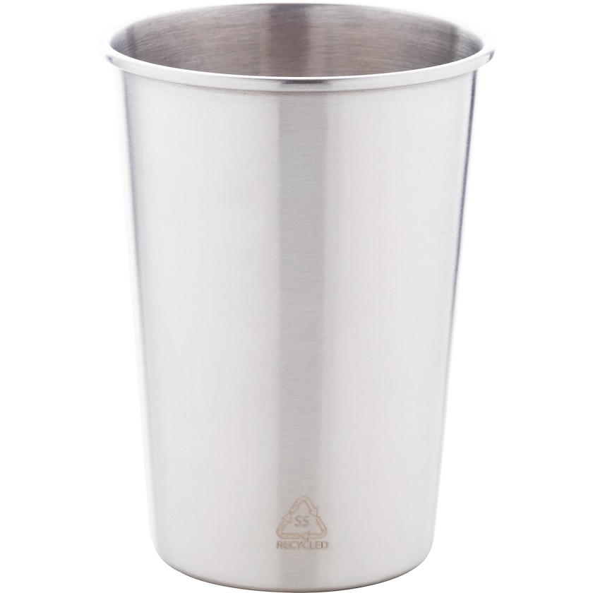 Mug en métal en acier inoxydable recyclé. Le mug a des parois simples et peut contenir 35 cl.