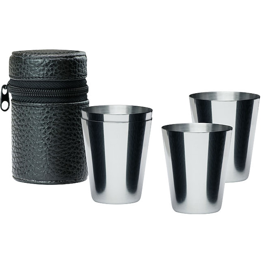 Quatre mugs en métal en acier inoxydable livrés dans un étui en cuir synthétique. Les prix de la gravure laser comprennent la gravure laser sur les quatre mugs.