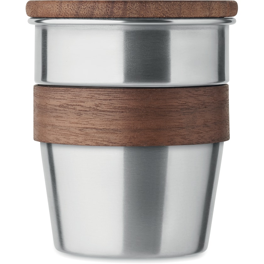 Mug exclusif en acier inoxydable recyclé et noyer. La tasse a une seule paroi et est composée à 90 % d'acier inoxydable recyclé et à 10 % d'acier inoxydable ordinaire. La poignée doit être retirée lors du lavage. Étant donné que la tasse a une seule paroi, un transfert de chaleur peut se produire avec les boissons chaudes.