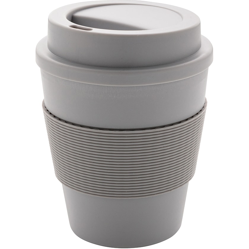 Mug de voyage 35 cl avec couvercle et zone de préhension en silicone. Le mug lui-même est fabriqué en polypropylène recyclable à 100%. Le mug peut passer au micro-ondes comme au lave-vaisselle.