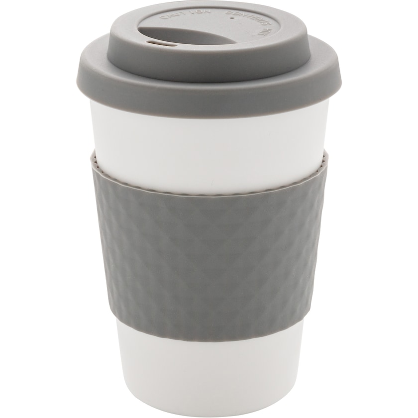Mug de voyage avec couvercle et zone de préhension en silicone. Le mug possède une capacité de 27 cl. Le mug peut passer au lave-vaisselle et au micro-ondes. Convient à la plupart des machines à café.