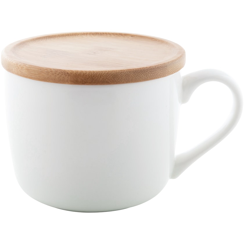 Grande tasse en porcelaine avec couvercle en bambou. Le couvercle peut également être utilisé comme dessous de verre. Livré dans un emballage cadeau individuel. Le mug peut être personnalisé par impression, le couvercle par gravure laser.