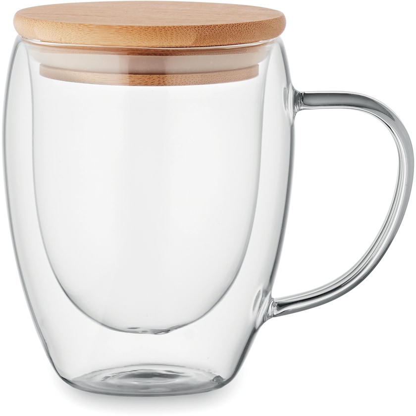 Mug en verre à double paroi et couvercle en bambou. Grâce aux doubles parois, la boisson reste chaude plus longtemps. L'impression peut être réalisée en deux couleurs maximum.