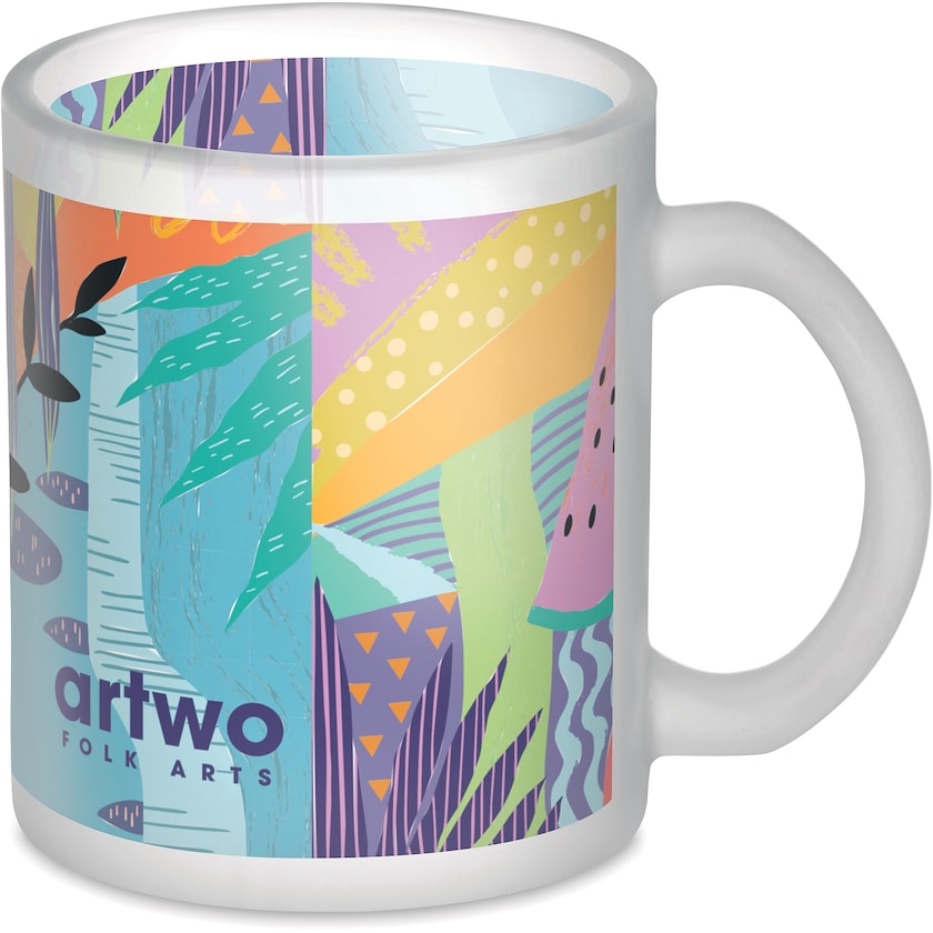 Mug en verre givré avec impression photo. Le mug possède une contenance de 30 cl et une élégante surface givrée. La personnalisation est réalisée par impression photo en quadrichromie, il est possible d'y apposer des motifs très complexes.