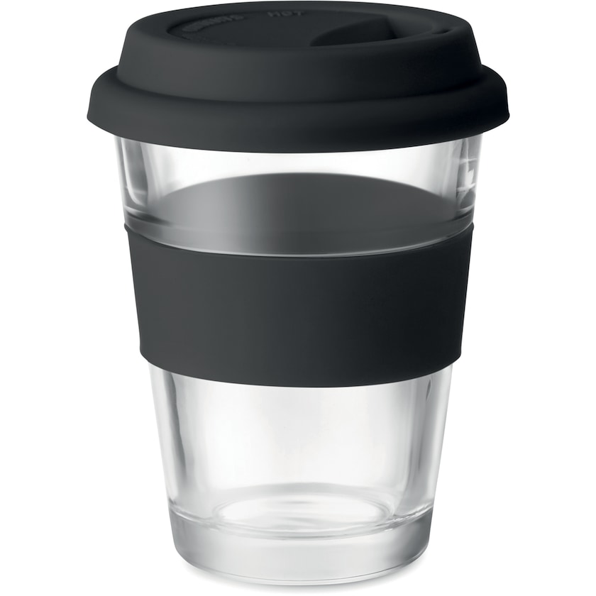 Mug en verre avec couvercle et zone de préhension en silicone. Le mug possède une contenance de 35 cl.
