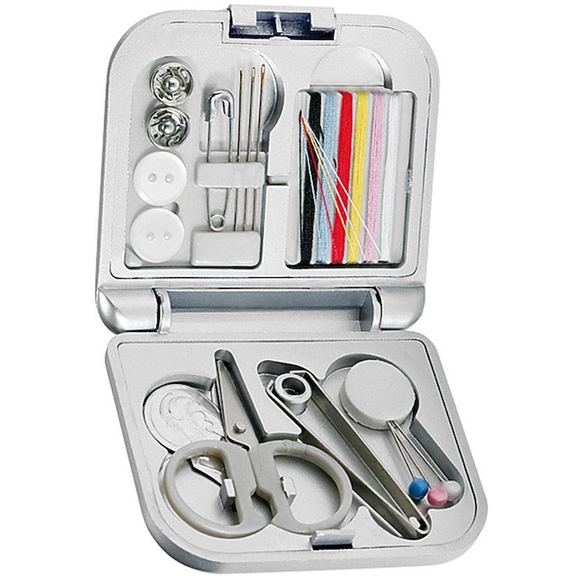 Nécessaire de couture abordable dans une boîte en plastique argentée.
