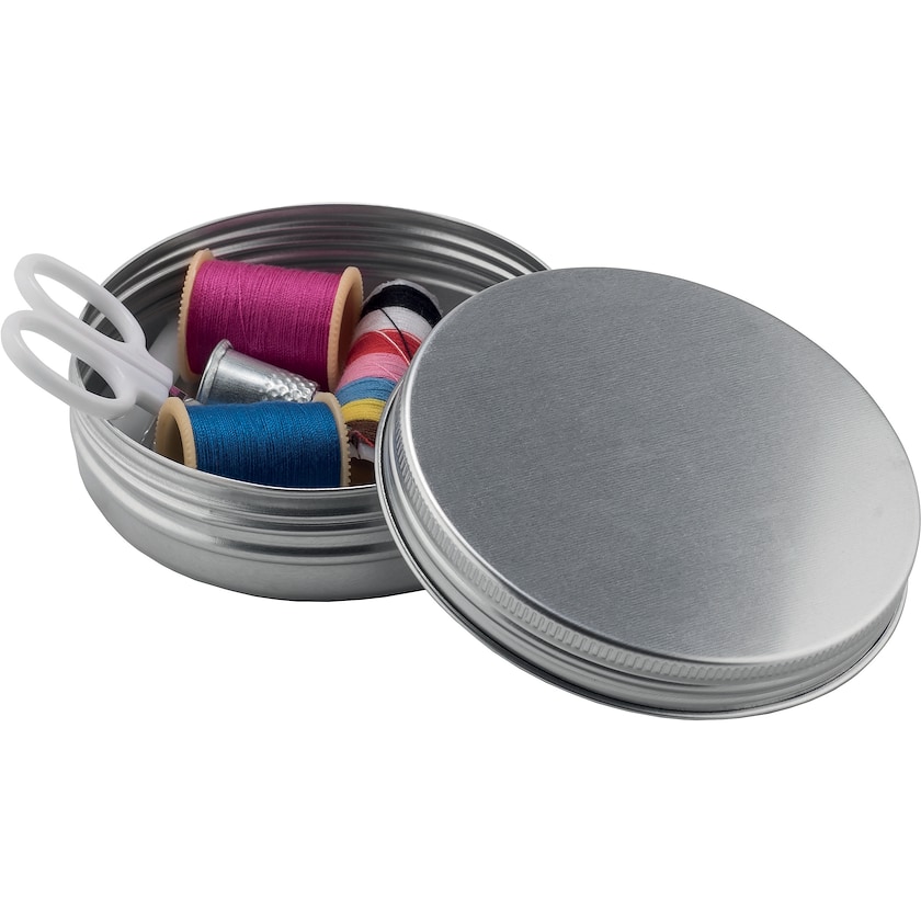 Nécessaire de couture classique en étain. Contient entre autres du fil de différentes couleurs, une paire de ciseaux, un dé à coudre, des épingles à nourrice et des boutons. La personnalisation peut être effectuée soit par impression soit par gravure laser.