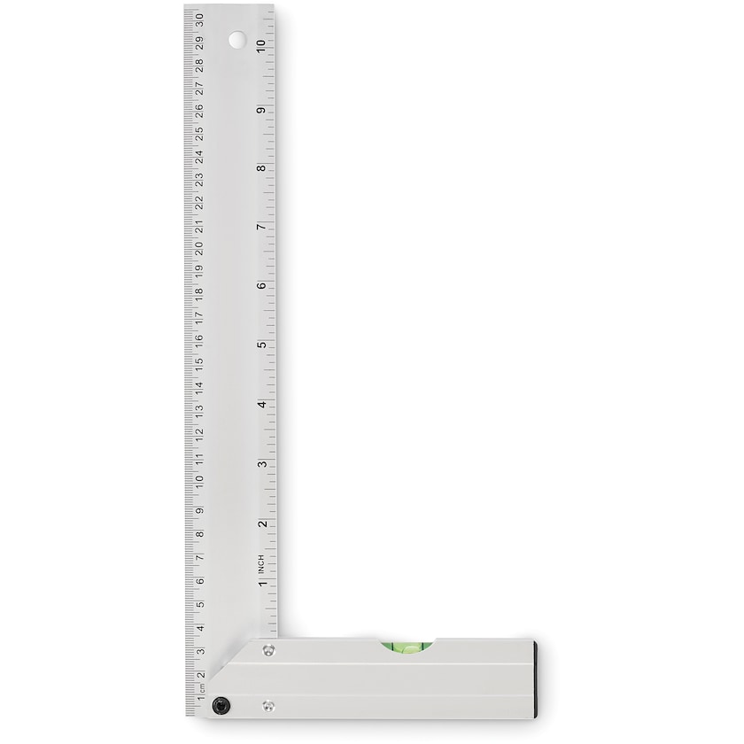 Équerre en aluminium avec niveau à bulle. Le marquage peut être réalisé soit par impression, soit par gravure laser.
