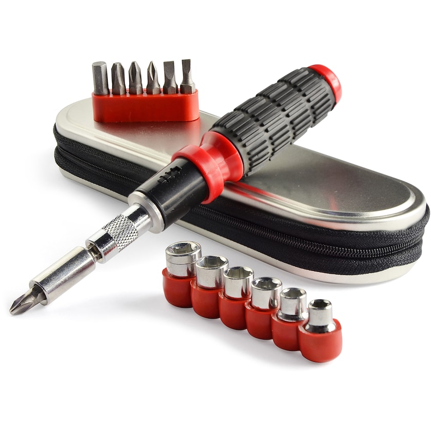 Set d'outils professionnels contenant un tournevis et des embouts. Le set est livré dans une boîte en métal pratique avec fermeture éclair. La personnalisation est effectuée sur la boîte.